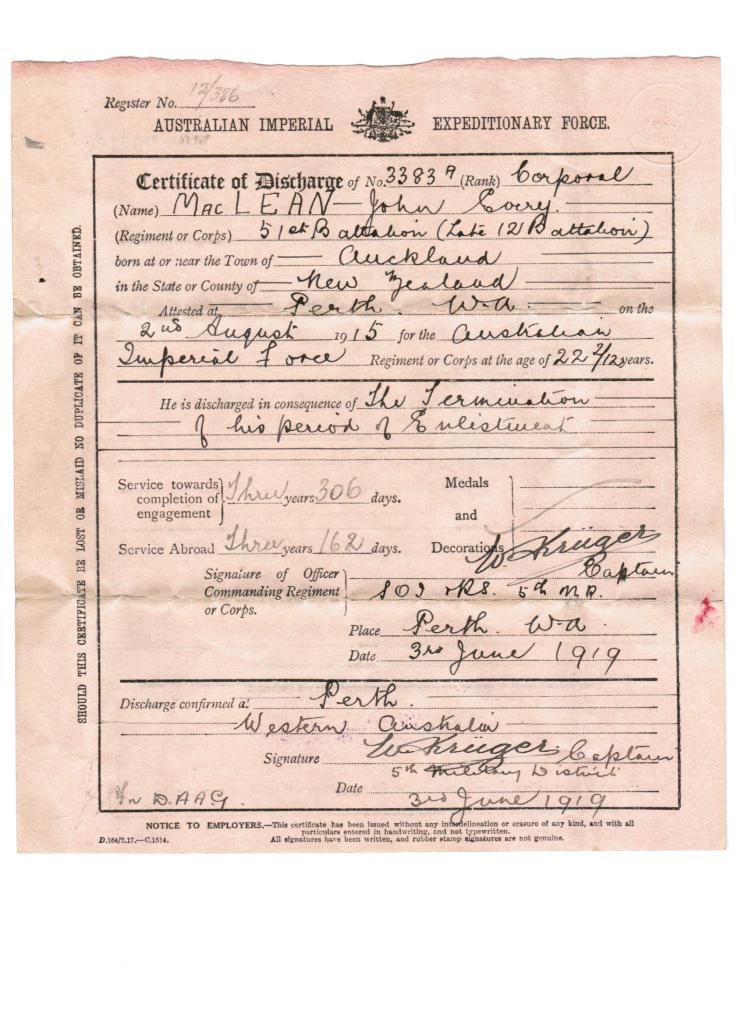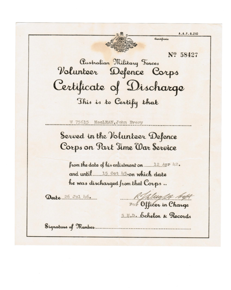Cpl John Every Maclean 1st AIF, 52nd Bn. WIA in the trenches of France. Served as Sgt in WW11 in a troop training capacity and in the Volunteer Air Observer Corps.