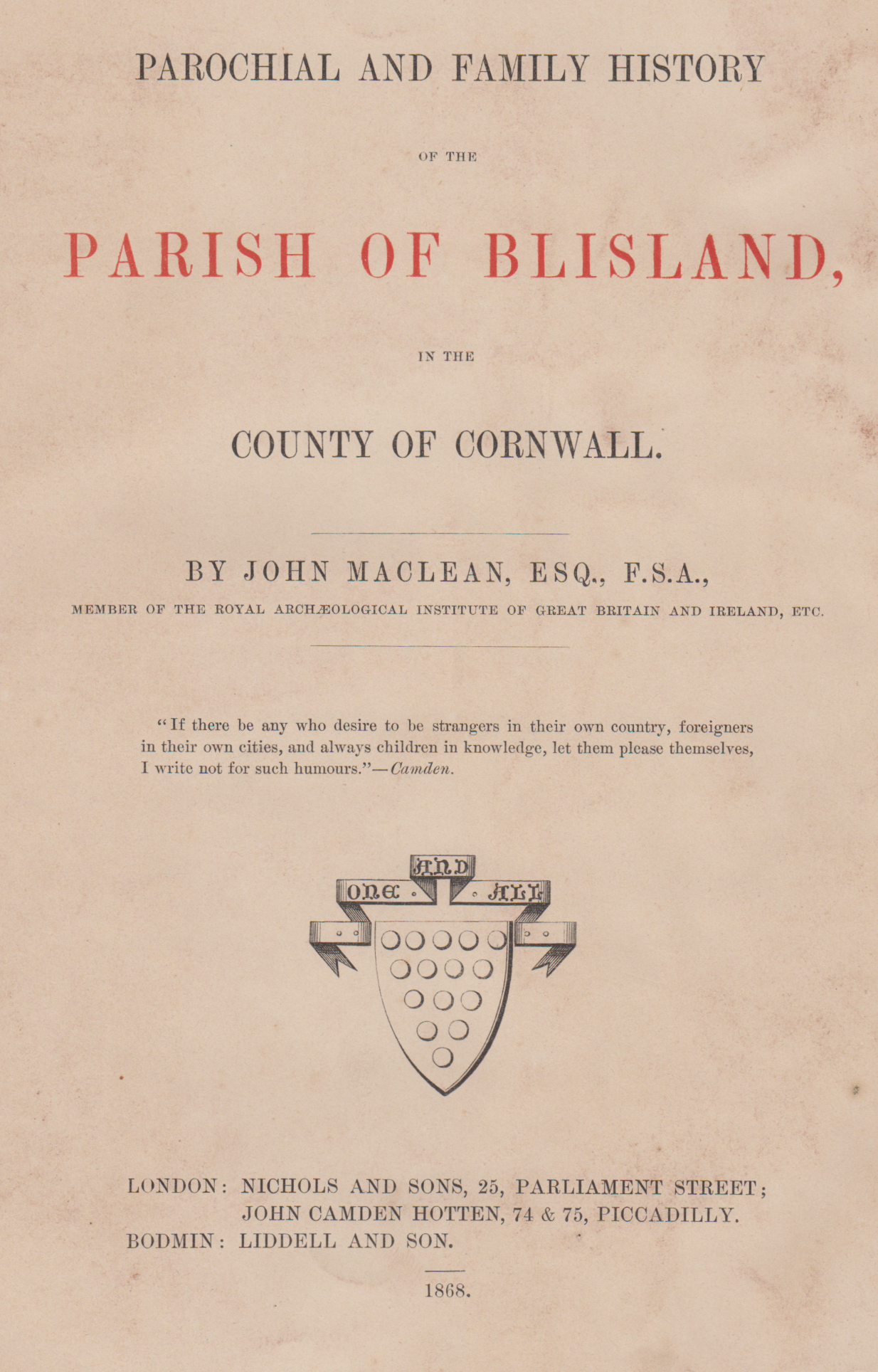 Title page of first edition of “History of Blisland” (before the knighthood):