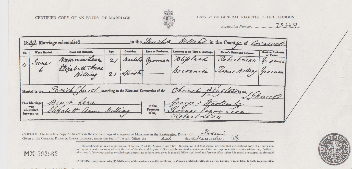 The above is a transcript of Benjamin John Lean’s baptism record as recorded in the Blisland Church baptisms, marriages and burials registers. The Church is dedicated to Saint Protus and Saint Hyacinthus (whoever they might have been) and known locally as Saint Pratts. Further details of Ben junior’s parents, ‘Ben & Eliz’, are set out in the next section.